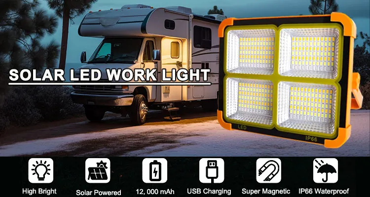 Custom solar LED work light absorbs sunlight with efficient conversion rate, emits super bright cool white light to light up a nice size area indoors or outdoors. You would find it a great portable light for camping, car repairing, fishing, construction site, garage, workshop, power outages, painting projects, etc.